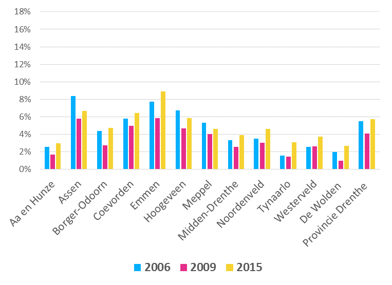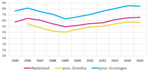 Tussen 2006 en 2009 daalde in het hele land het aandeel 0- t/m 17-jarigen dat in een gezin met een bijstandsuitkering leeft. Vanaf 2009 is er een onverminderde stijging te zien. In de provincies Groningen en Drenthe doen deze trends zich ook voor, met als gunstige uitzondering een zeer lichte daling in het meest recente cijfer (2015 ten opzichte van 2014). Het aandeel jongeren dat opgroeit in een bijstandsgezin ligt in de provincie Groningen al jarenlang hoger dan landelijk, in 2015 bijna 2 procentpunten. Drenthe steekt juist gunstig af tegen het landelijke beeld. Voor beide provincies geldt overigens dat er grote onderlinge verschillen zijn tussen de gemeente.