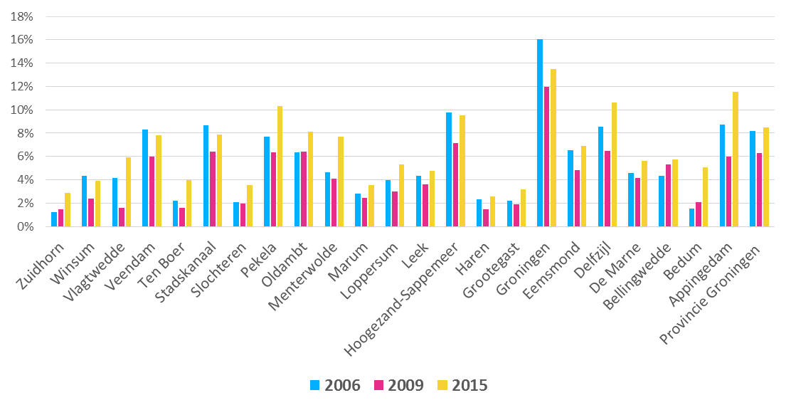 De trends die hierboven zijn benoemd zijn ook te herkennen in de cijfers over afzonderlijke Drentse en Groningse gemeenten. Vrijwel overal was 2009 het jaar waarin het percentage kinderen in bijstandsgezinnen het meest gunstig was. In 9 van de 12 Drentse gemeenten en 18 van de 23 Groningse gemeenten zijn de cijfers over 2015 minder gunstig dan die over 2006. De percentages zijn per gemeente weergegeven in de figuren 2 en 3.